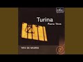 All three of Turina's mature piano trios use a three movement form harkening back to the first classical piano trios of Haydn and Mozart. The first movement follows a sonata outline with clear, contrasting themes first in minor, then major keys, followed by a developmental interlude introducing fresh melodic material. The second movement is a brief but dense scherzo based on a spicy dance rhythm, a bright countermelody and a languid trio. The finale is a majestic landscape miniature with all the poetry and perfume of great Spanish music. A rondo, it visits a number of vivid scenes between recurring refrains of a dark, masculine cast. Using a technique that Turina likely acquired from his French schooling, he takes a cyclic look backward in the final episode, recalling all the themes from previous movements before a dazzling entrance into the final, wonderfully elaborated refrain.