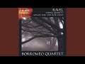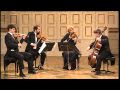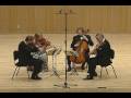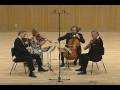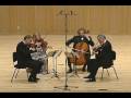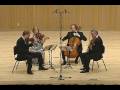 The two inner movements of Ravel's quartet are particularly rich and fascinating. The second movement is a lively scherzo in a triple meter with a contrasting trio section. The dominant use of pizzicato perfectly punctuates a delightful rhythmic complexity based on the syncopated cross-rhythms of playing 6/8 and 3/4 in alternating measures as well as simultaneously in different instruments. Further subdivisions of the beat overlay this Iberian dance rhythm with triplets (three to a beat) in the main theme and thirty-second notes (four to a beat) in the middle parts. Combing displaced accents, trills, the shivering rasp of rapid tremolo and swiftly changing dynamics, the scherzo dazzles with the precise choreography of its interlocking parts. The trio slows into languid repose with an elegant melody in the lower strings tinged with still more Spanish perfume. But unlike most trios, this one is essentially a reconfiguration of the scherzo, made of the same musical materials: one of the two scherzo themes can be heard in nearly every measure of the trio, transformed by the slow tempo, fragmented, and shifted into the background. Most trios finish with a definite closure; in a single clear gesture, they return to the beginning of scherzo thereby emphasizing a strongly sectional form. Ravel has his scherzo gently creep back in, overlapping with the trio to create a smooth continuity that is subtle and expertly crafted. Unique in the literature, it is characteristic of Ravel's mature style.