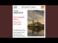 His Piano Trio in E Major dates from 1891 and blends elements of the early Viennese romantic style with the richer more florid writing of late romantic French chamber music. The opening movement, Allegro commodo, begins quietly but quickly gets moving. The main theme is based on an upward scale passage. If one listens carefully, one can hear tinges of Spanish melody. The second theme is quite lyrical. The second movement, Andante, highlights the singing quality of Bretón's writing and its pacing clearly shows him as a master of music for the stage. One can well visualize a lovely duet between singers. A charming scherzo, Allegro molto, follows. Here the influence of the late French romantics, in particular Saint-Saens, can be heard. The finale, Allegro energico, begins with a rhythmically unusual theme. The music is brilliant and animated.