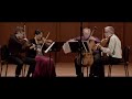 The string quartet in A Major, K. 464 is the fifth of the set. The first movement is in sonata form with numerous articulated sections that flow together easily like the continuous bends in a single river. Two chief motives appear right in the beginning, a repeated note landing on the downbeat followed by soft, looping descent of faster notes, a two-part signature stitch throughout the musical fabric particularly when abbreviated into a compact six-note motto. Building elaborate musical structures from a few omnipresent motives comes from Haydn, as does Mozart's use of early and nearly constant "development." Notice how quickly the first theme moves into a minor key, already a departure early in the exposition. Notice also how repetition always brings variation, often by deferring an expected resolution with elegant imitations as contrapuntal elaborations. The formal development section is a long skein of these imitations gently swinging to a 6/8 beat with an elegant grace unique to Mozart's hand.